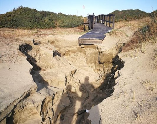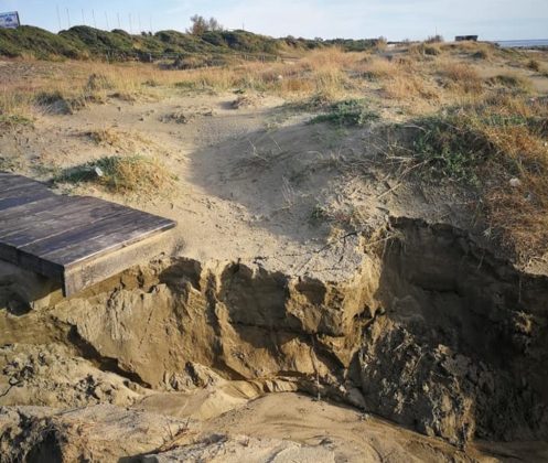 Dalla passerella di legno uno strapiombo di almeno 3 metri che continua fino al mare. Evidentemente la conseguenza del maltempo e delle mareggiate di questi ultimi giorni. L’inverno è ormai arrivato e sul lungomare di Latina non c’è traccia di quella destagionalizzazione su cui tanto si è discusso nei mesi precedenti.