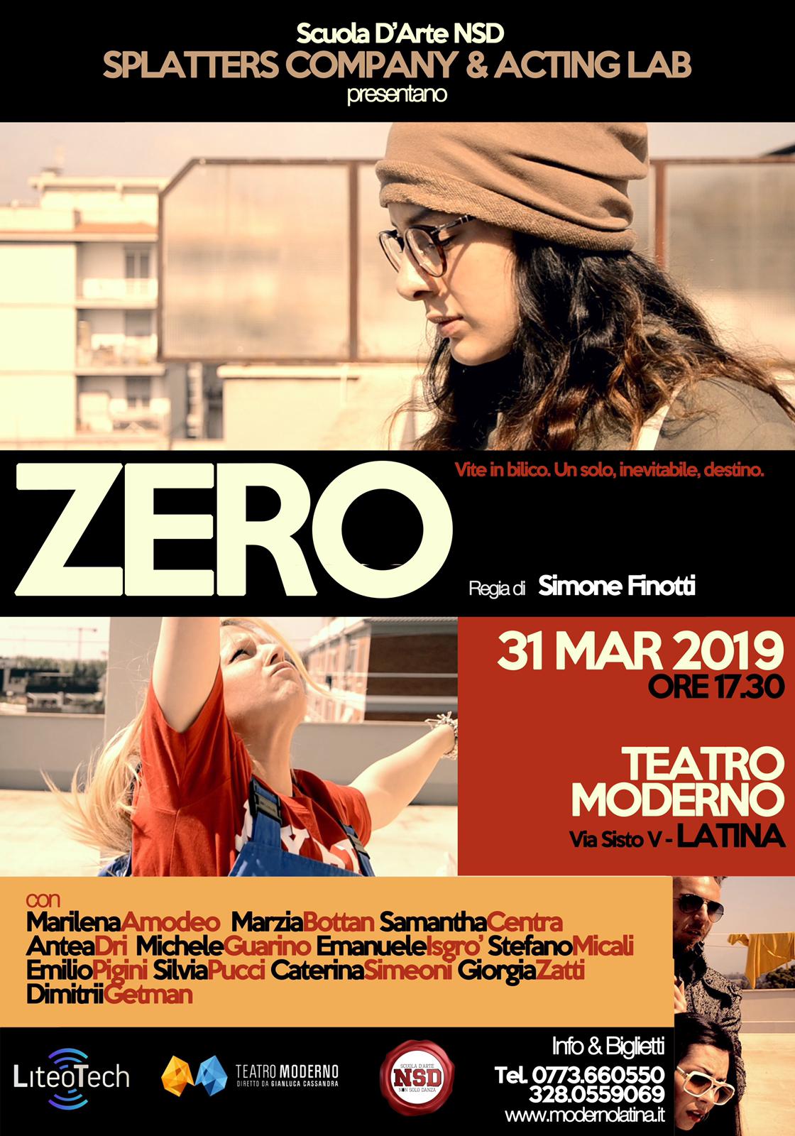 La compagnia della Non Solo Danza diretta da Simone Finotti, ormai in scena da un lustro, ha all’attivo numerose repliche, molte iniziative socio- culturali e numerose campagne di solidarietà. Con questa pièce la compagnia torna in scena dopo il successo registrato alla prima, dieci mesi fa, grazie ad una collaborazione con il Teatro Moderno e Gianluca Cassandra. “Zero” è ambientato in città come tante e racconta la storia di un gruppo di ragazzi come tanti. La storia è racchiusa in un cerchio, le cose, i fatti e tutto si ripete inesorabilmente con gli stessi imperdonabili errori. Una generazione priva di possibilità, uomini e donne che cercano una strada da percorrere e insieme combatteranno per dare un senso alla loro esistenza. “Zero” due generazioni, i vent‘enni e i trent‘enni di oggi alle prese con la vita, la voglia di riscatto, la lotta al progresso. Tutti uniti verso un futuro incerto ma con la voglia di vincere. Sul palco rigorosamente in ordine alfabetico, Marilena Amodeo, Marzia Bottan, Samantha Centra, Antea Drì, Dimitri Getman, Michele Guarino, Emanuele Isgrò, Stefano Micali, Emilio Pigini, Silvia Pucci, Caterina Simeoni, Giorgia Zatti. Regia di Simone Finotti